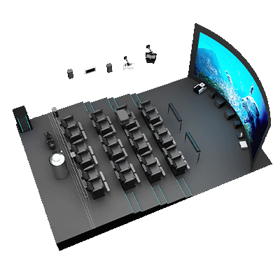 5D影院由三部分組成:立體投影系統;振動座椅和特效設備;計算機控制系統。這三者的協同作用形成一個系統,刺激觀眾的視覺、聽覺、觸覺和感官,再現電影主題所涉及的環境、環境中的各種細節、讓觀眾感受身臨其境的整體效果。